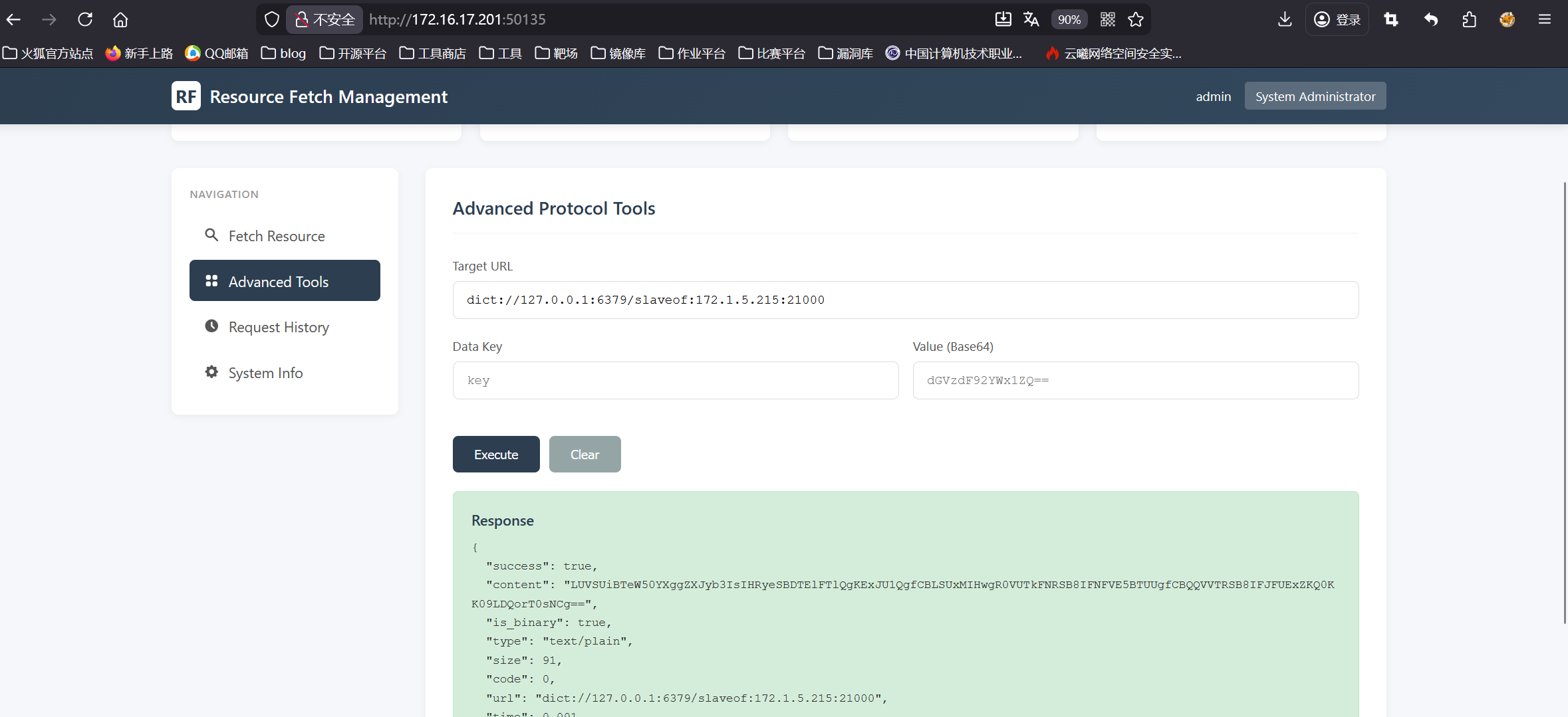 <div class="content-section" id="advanced-section"> <div class="panel"> <div class="panel-header"><div class="panel-title">Advanced Protocol Tools</div></div> <div class="form-group"> <label class="form-label">Target URL</label> <input type="text" class="form-input" id="advancedUrl" placeholder="url"> </div> <div class="info-grid"> <div class="form-group"> <label class="form-label">Data Key</label> <input type="text" class="form-input" id="advancedKey" placeholder="key"> </div> <div class="form-group"> <label class="form-label">Value (Base64)</label> <input type="text" class="form-input" id="advancedData" placeholder="dGVzdF92YWx1ZQ=="> </div> </div> <div class="button-group"> <button class="btn btn-primary" onclick="doAdvanced()">Execute</button> <button class="btn btn-secondary" onclick="clearResult('advanced')">Clear</button> </div> <div id="advancedResult" class="result-panel"></div> </div> </div>