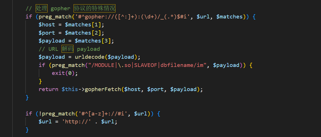 if (preg_match('#^gopher://([^:]+):(\d+)/_(.*)$#i', $url, $matches)) { $host = $matches[1]; $port = $matches[2]; $payload = $matches[3]; $payload = urldecode($payload); if (preg_match("/MODULE|\.so|SLAVEOF|dbfilename/im", $payload)) { exit(0); } return $this->gopherFetch($host, $port, $payload); }